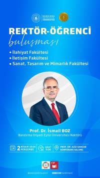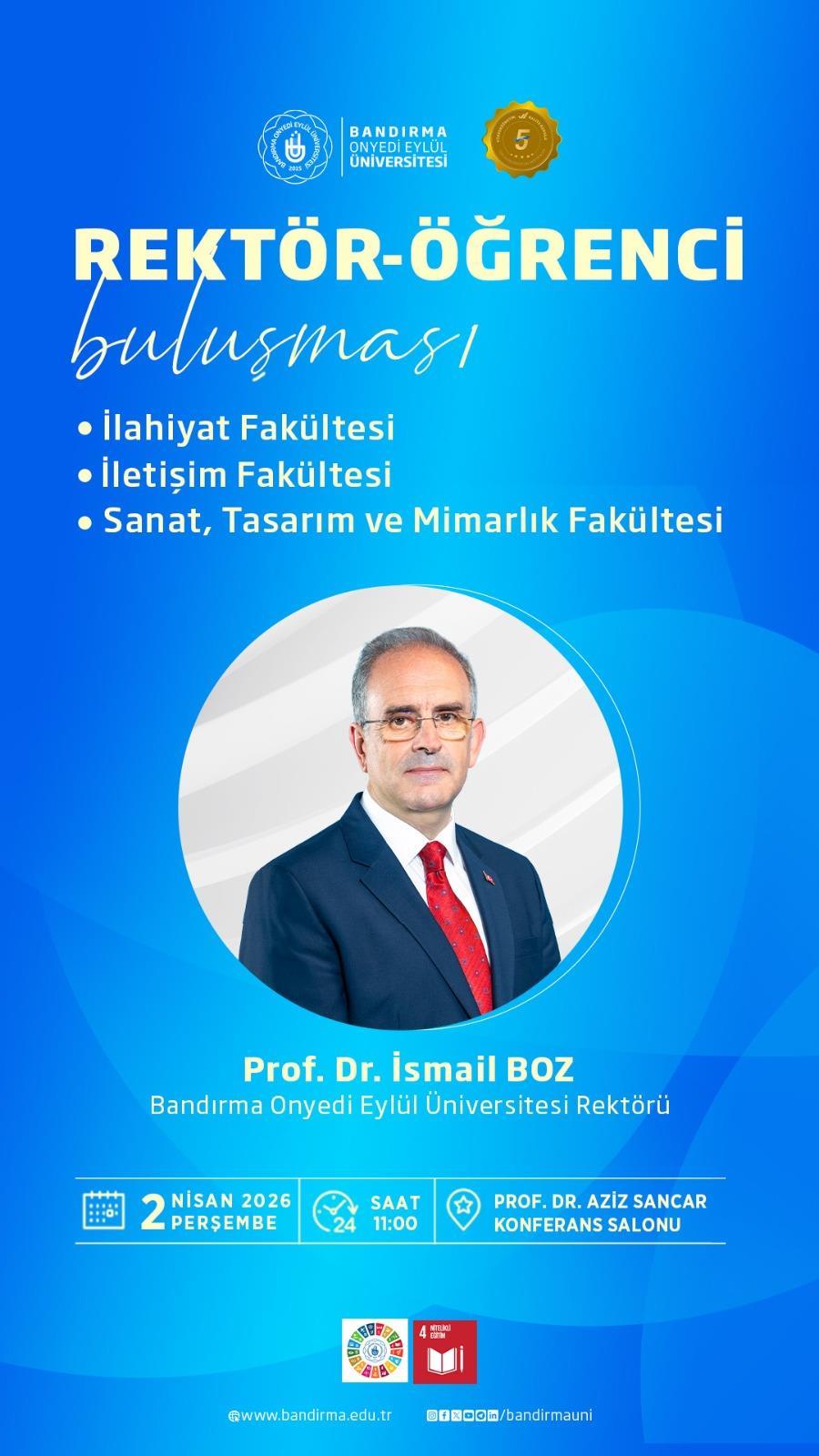 Rektörümüz Prof. Dr. İsmail Boz’un katılımıyla 02.04.2026 Perşembe günü “Rektör - Öğrenci Buluşması” programı gerçekleştirilecektir. Program kapsamında Fakültemiz ile Sanat, Tasarım ve Mimarlık Fakültesi ve İlahiyat Fakültesi öğrencilerimiz Rektörümüz ile bir araya gelecektir.