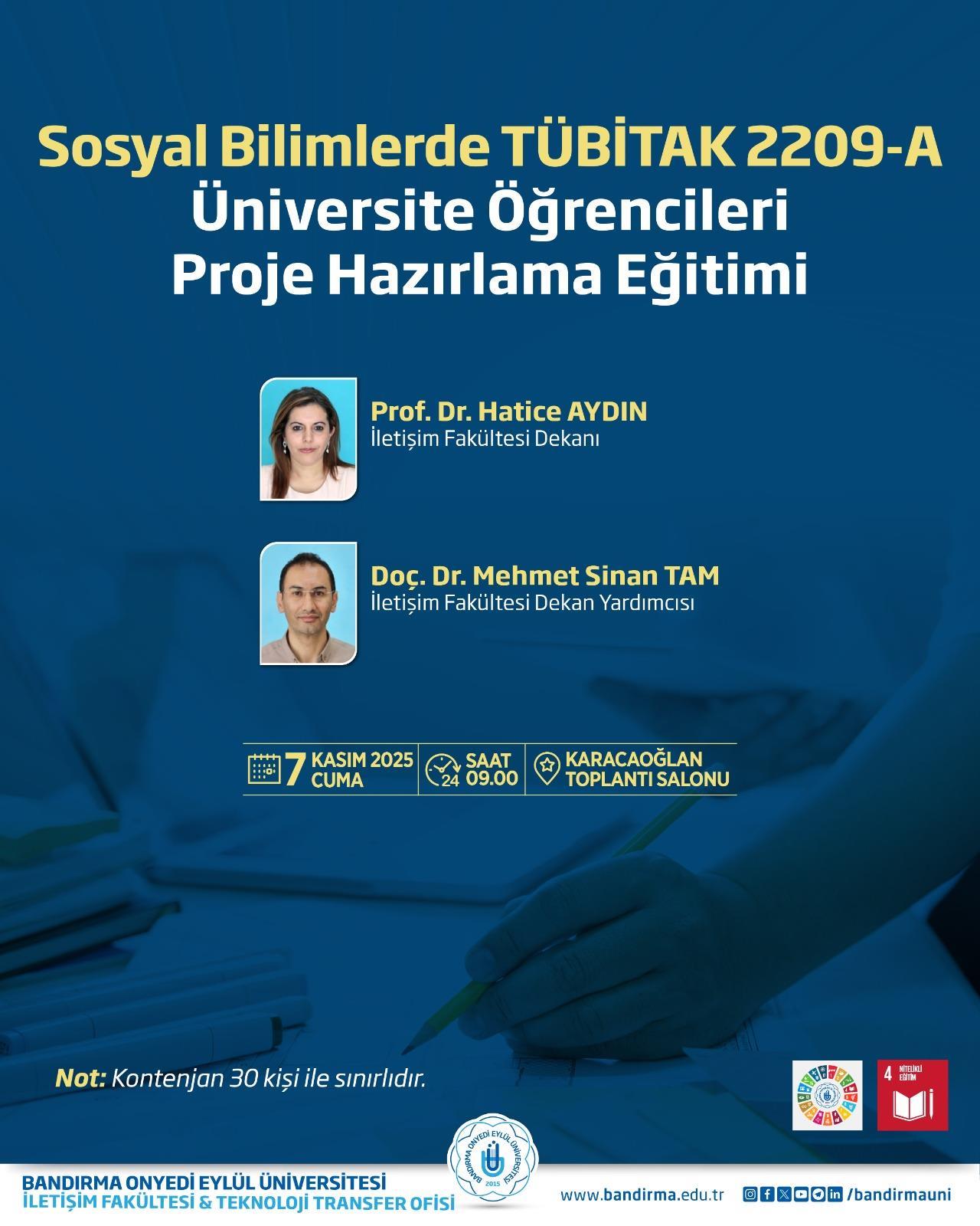 İletişim Fakültemiz ve Teknoloji Transfer Ofisimiz iş birliğinde, öğrencilerimizin bilimsel araştırma ve proje yazma becerilerini geliştirmek amacıyla “Sosyal Bilimlerde TÜBİTAK 2209-A Üniversite Öğrencileri Proje Hazırlama Eğitimi” düzenlenecektir.