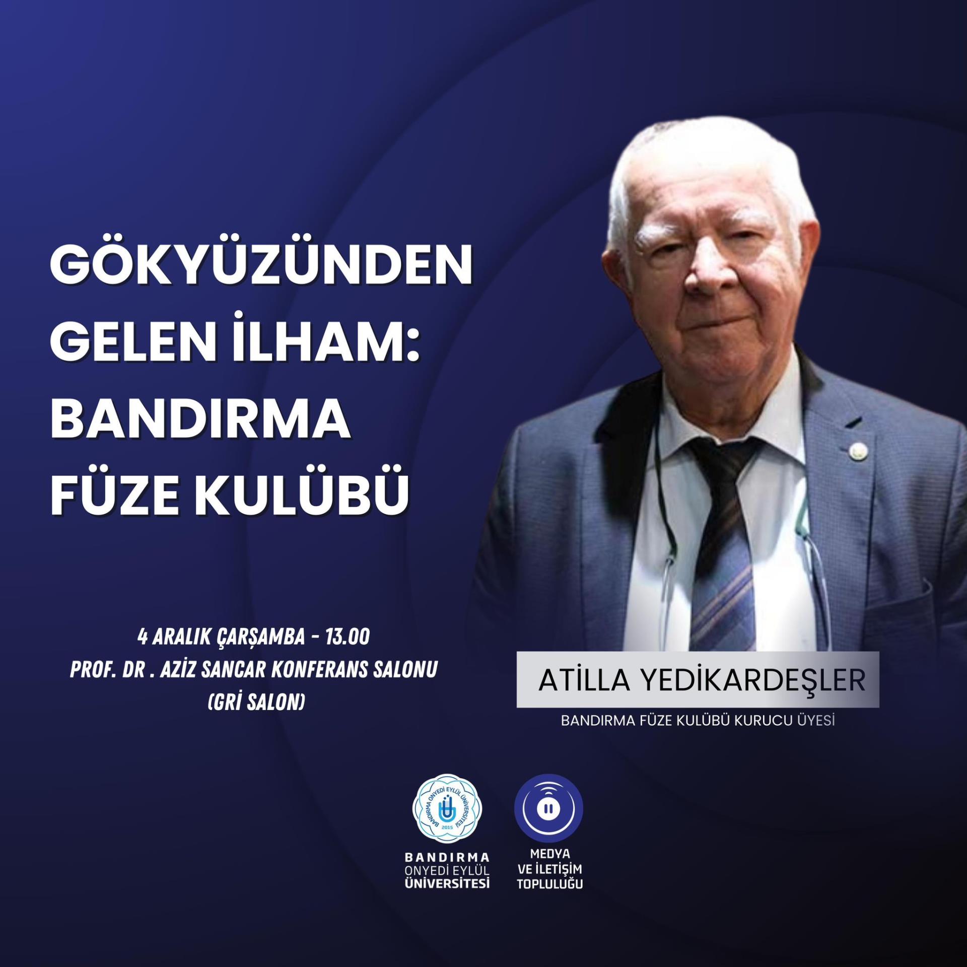Bandırma Füze Kulübü kurucularından Atilla YEDİKARDEŞLER'in katılımıyla 04.12.2024 Çarşamba günü saat 13.00'de Üniversitemiz Prof. Dr. Aziz Sancar Konferans Salonunda "GÖKYÜZÜNDEN GELEN İLHAM: BANDIRMA FÜZE KULÜBÜ" konulu konferans düzenlecektir.