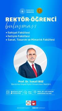 Rektörümüz Prof. Dr. İsmail Boz’un katılımıyla 02.04.2026 Perşembe günü “Rektör- Öğrenci Buluşması” programı gerçekleştirilecektir. Program kapsamında Fakültemiz ile Sanat,Tasarım ve Mimarlık Fakültesi ve İlahiyat Fakültesi öğrencilerimiz Rektörümüz ile bir araya gelecektir.